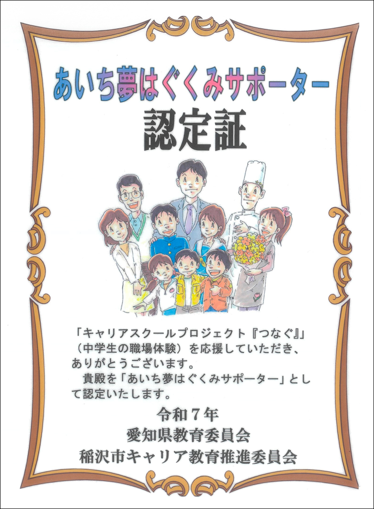 稲沢西中学校の生徒さんの職業体験を受け入れていることから認めていただいたものです。
