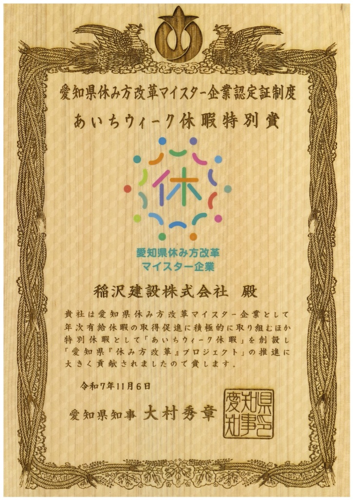 令和7年11月6日 「あいちウィーク休暇特別賞」を受賞しました。