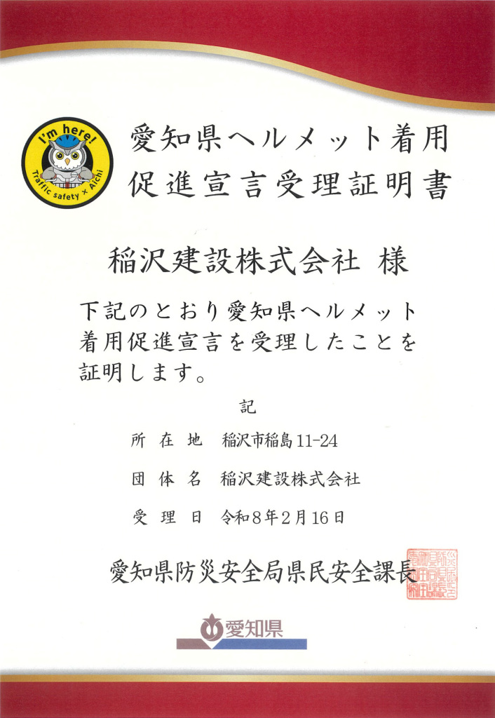 愛知県のヘルメット着用促進に係る取組に賛同し、ヘルメット着用促進宣言を行いました。